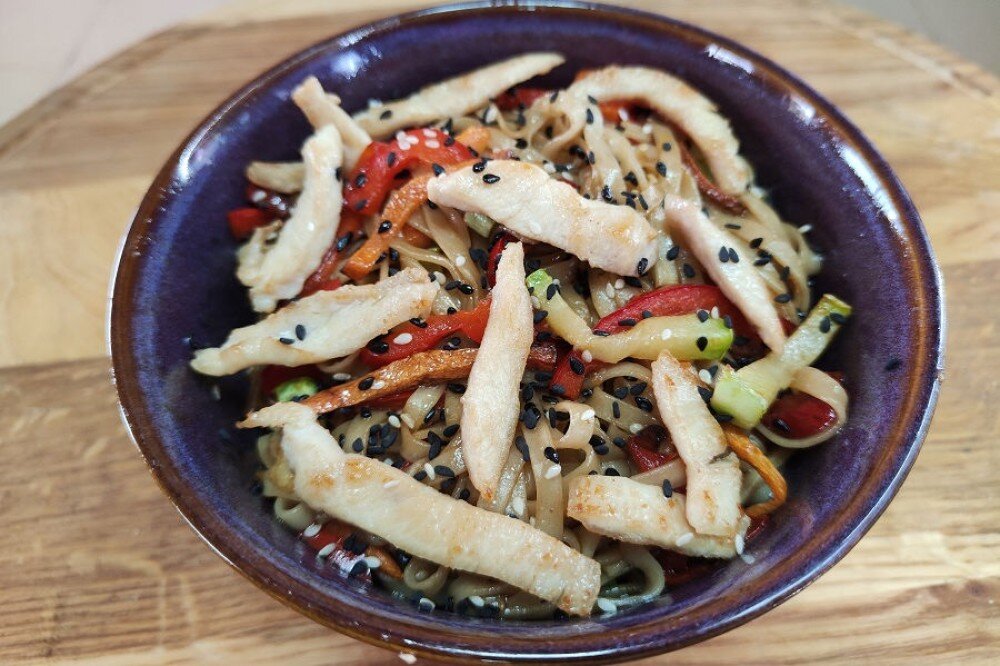 Удон (пшеничная лапша), куриное филе, кабачок, морковь, перец болгарский, зелень, кунжут, соус на выбор