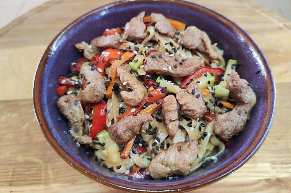 Удон (пшеничная лапша), свинина, кабачок, морковь, перец болгарский, зелень, кунжут, соус на выбор