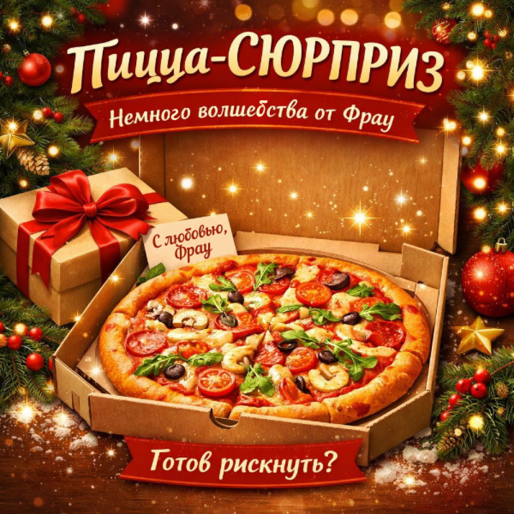 Не можете выбрать, какую пиццу заказать? Доверьтесь Фрау и попробуйте Пиццу-СЮРПРИЗ! Интрига в каждой коробке. Готов рискнуть?