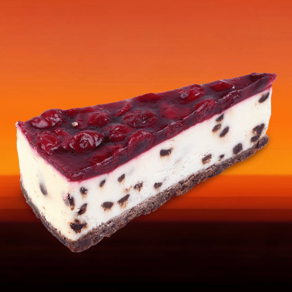 Десерт с кусочками горького шоколада на корже из сахарного печенья и верхним слоем из натуральных ягод вишни