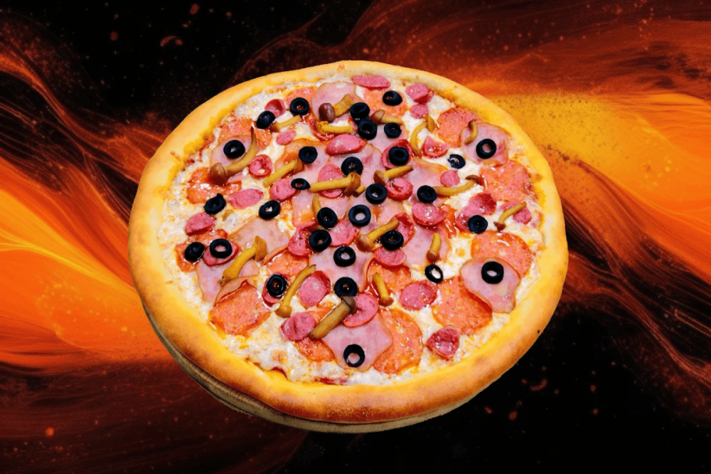 Тонкое тесто, фирменный красный соус, сыр моцарелла, пепперони, охотничьи колбаски, ветчина, опята маринованные, маслины