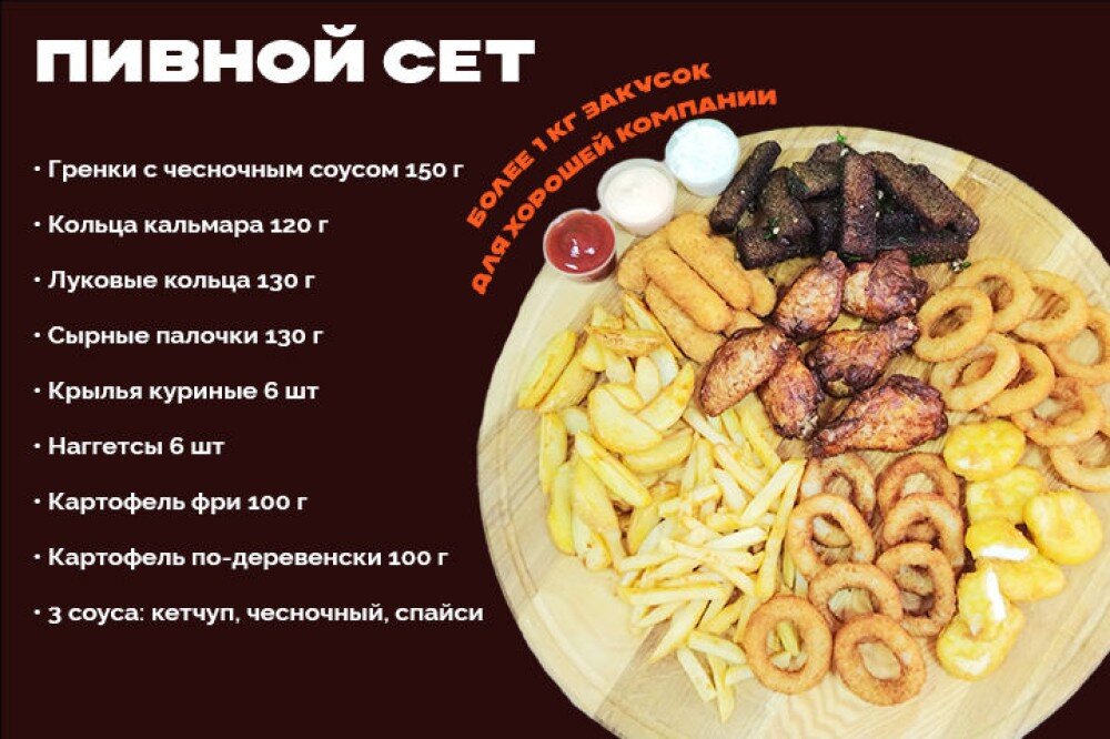 Гренки с чесночным соусом 150г, кольца кальмара 120г, луковые кольца 130г, сырные палочки 130г, крылья куриные 6 шт., наггетсы 6шт., картофель фри 100г, картофель по-деревенски 100г + 3 соуса (150 г) - кетчуп, чесночный, барбекю